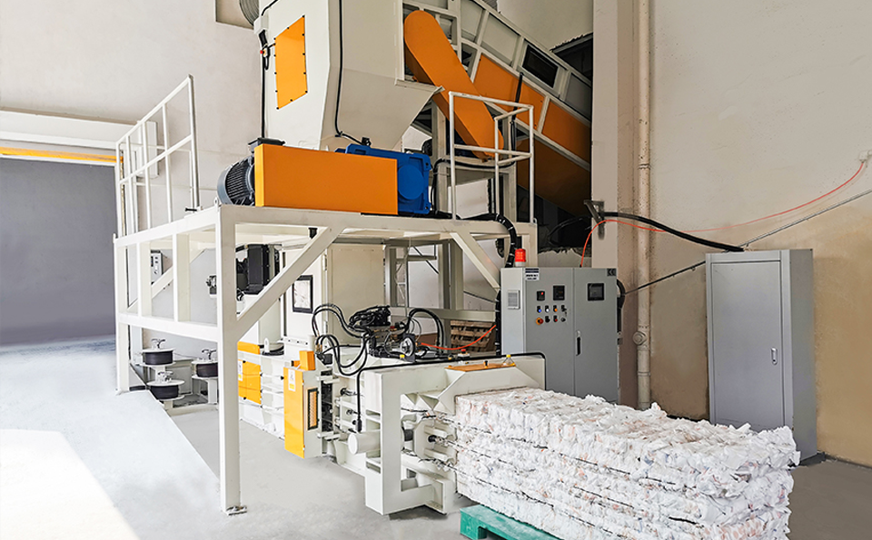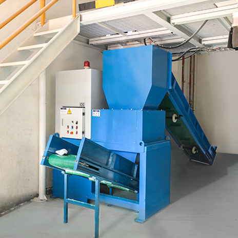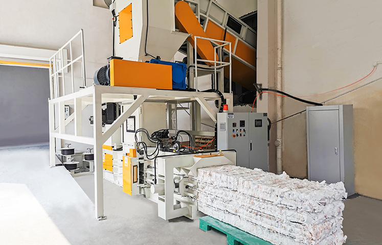 Defective products can be transported to the crushing and baling machine either by air delivery or manual intervention (via a conveyor line). First, the products are finely shredded (to prevent polymer leakage from defective items), then automatically baled for convenient recycling.