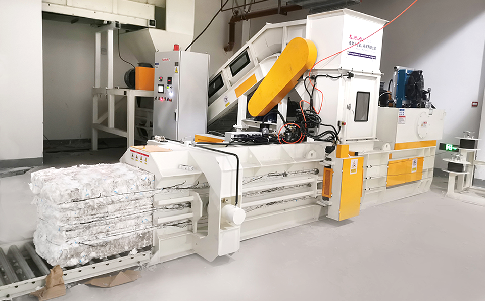 In the sanitary care products industry, scraps (non-woven fabric, dust-free paper) and defective products (e.g., diapers, sanitary napkins, pads) can be automatically collected, shredded, packaged, and dedusted via an online recycling system.